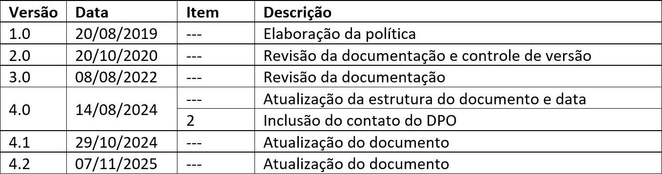 O presente documento foi elaborado em conformidade com a Lei Geral de Proteção de Dados Pessoais - LGPD (Lei 13.709/18) e o Marco Civil da Internet (Lei 12.965/14). O documento poderá ser atualizado em decorrência de eventual atualização normativa, razão pela qual o usuário deve consultar periodicamente esta seção.